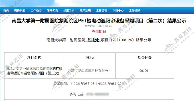 前段時間,南昌大學第一附屬醫院象湖院區PET樓電動遮陽簾對外進行采購項目招標,需要解決頂部遮陽問題,現賽尚遮陽已中標。