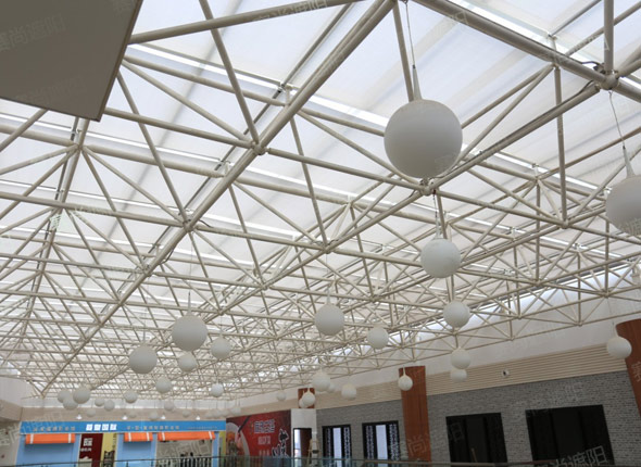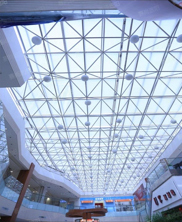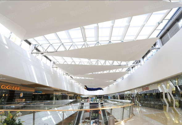 在采光頂遮陽方案設計中,一般都認為天棚簾之間空隙設計的越小越好,遮陽效果、隔熱效果相對都更好,有些不規則的邊角就做成了固定的天棚簾(圖一、二),結果整體的裝飾美觀效果可能并不盡如人意。而如果在采光頂遮陽方案設計中天棚簾之間的空隙加大些,邊角不規則的地方也空出來,既減少了材料,同時整體的裝飾美觀效果卻好很多(圖三、四),而且透進來的陽光形成等距光格,整體效果更加美觀,也沒有增加多少的炎熱感。尤其是對于大型高檔商場,更加注重室內裝飾美觀效果,后者的遮陽方案效果顯然更美觀。值得我們去細細體會。