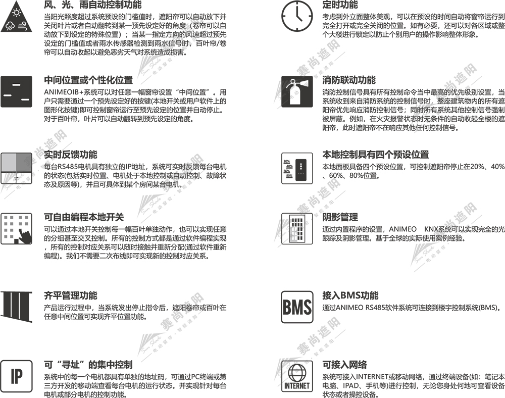 使用者可以通過接入數字化網絡(如互聯網、RS485網絡等)的電腦或觸屏設備對遮陽產品進行控制。遮陽系統也可以通過網絡與建筑中的其它系統如空調、照明等系統進行結合,通過對遮陽產品的精確控制,實現更佳的節能效果。