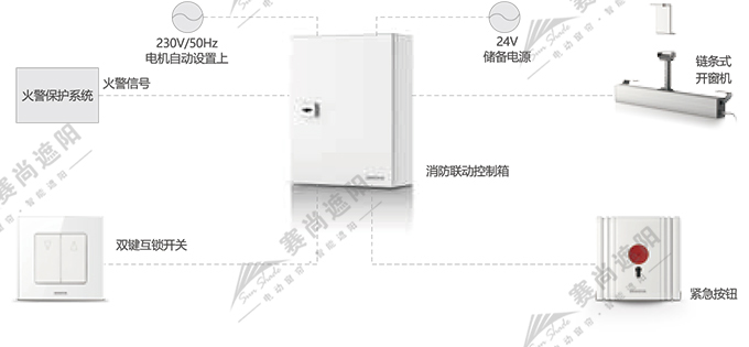當發生火災時,火警保護系統會發出火災報警信號給消防聯動控制器,消防聯動控制器就會打開玻璃窗,以便能把有毒煙霧排出。